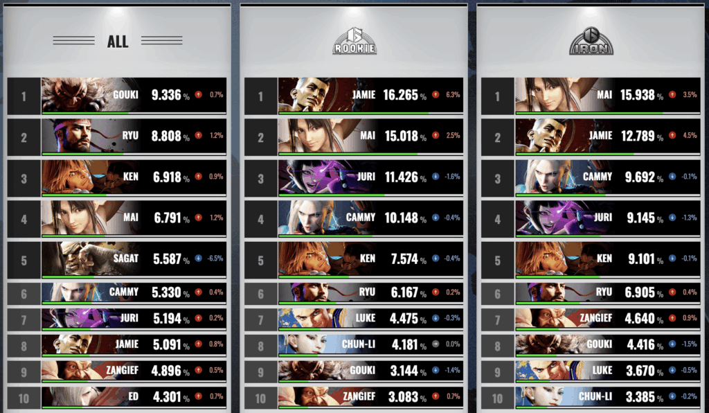 初心者帯ではモダン操作に対応したキャラの使用率が高い傾向があります。一方、プロ帯ではキャラ性能を最大限引き出せるクラシック操作が主流です。特にプロ大会ではJP・豪鬼・ケンの使用率が高く、安定した火力と技性能が評価されています。自分のレベルに合ったキャラを選ぶことが勝率を上げるポイントです。