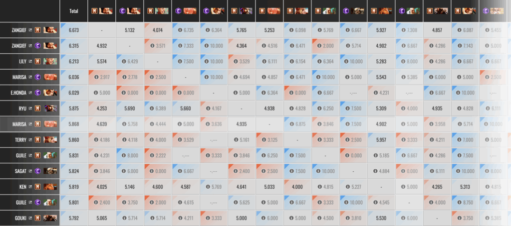 ダイヤグラムは、各キャラの対戦組み合わせごとの勝率をまとめたデータです。数値が高いほど有利、低いほど不利を意味します。CAPCOM公式サイトのBuckler’s Boot Campでは、勝率や使用率を統計的に確認できます。これを分析することで、自分のキャラがどの相手に強いかを把握できます。