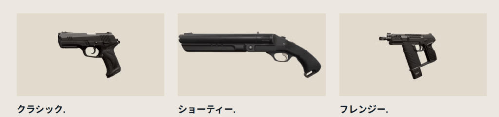 VALORANTの「クラシック」は、全プレイヤーが所持する無料のサイドアームです。単発射撃の精度が高く、右クリックによるオルト射撃では3発同時に弾を放つショットガンのような攻撃が可能です。