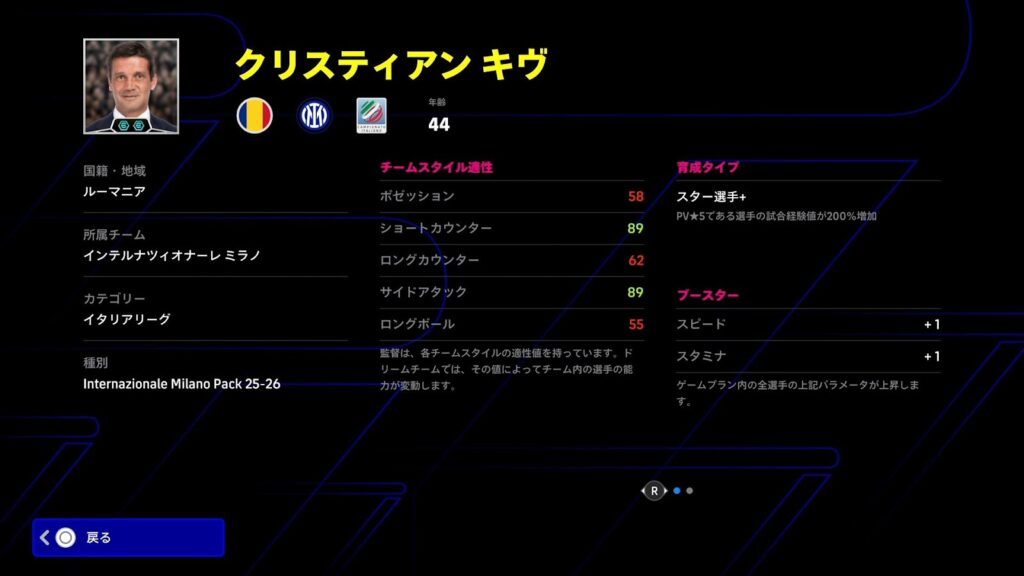 | チームスタイル適正 | ポゼッション:58ショートカウンター:89ロングカウンター:62サイドアタック:89ロングボール:55 |