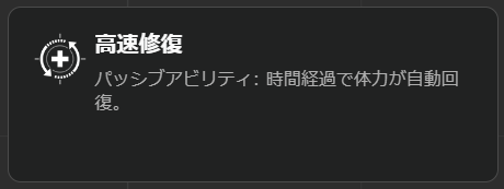 パッシブアビリティは高速修復で時間経過で体力を自動回復することができます。