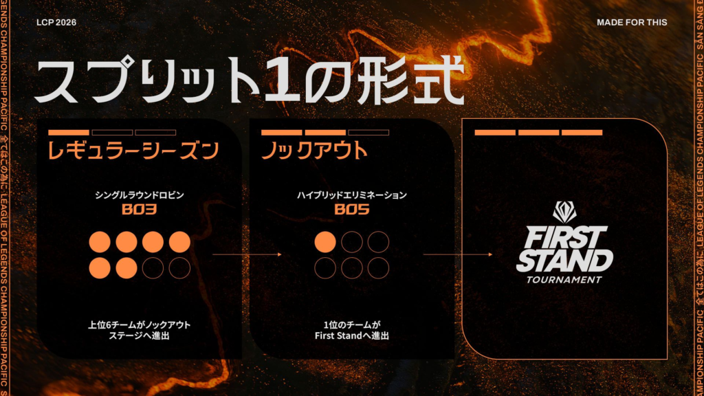 LCP2026シーズンは、年間を通じて 3つのスプリット に分かれて開催されます。各スプリットごとにレギュラーシーズンとプレイオフを戦い、成績に応じた国際大会の出場権や年間ポイントを争います。