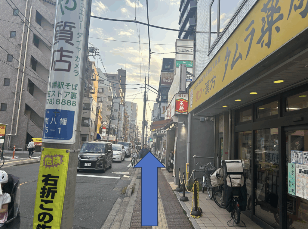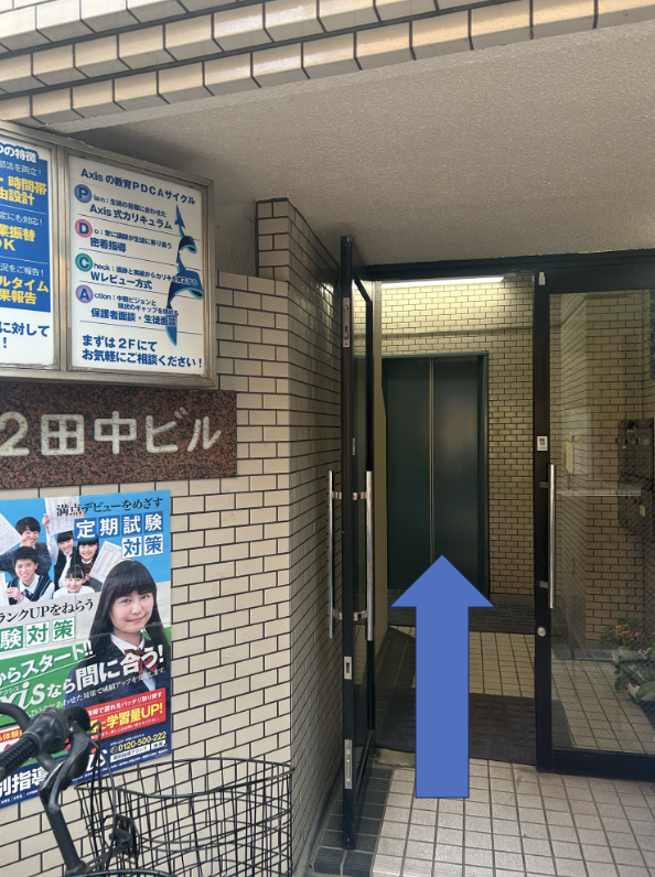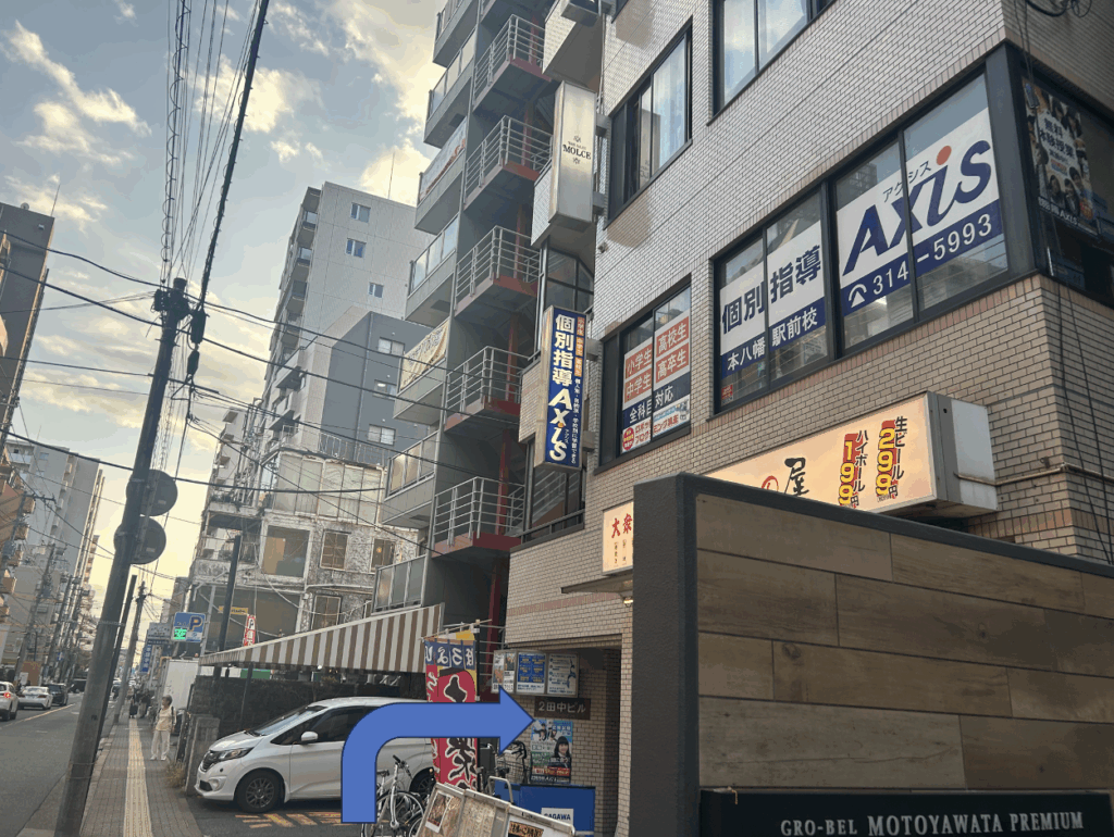 4.個別指導Axis本八幡駅前校という看板が見えたら、そちらが建物になります!中まで進んでいただき、エレベーターで5階へ上がるとAfras本八幡校がございます。