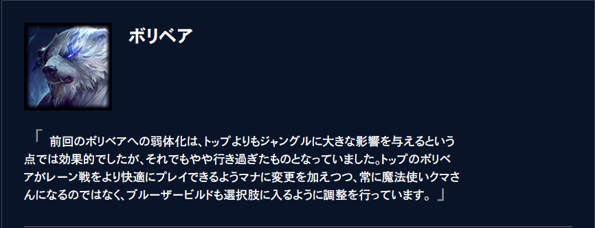 黄昏と暁の登場でTOPとJGで人気のあるボリベアですが前回のナーフで少し勝率を落としていました。