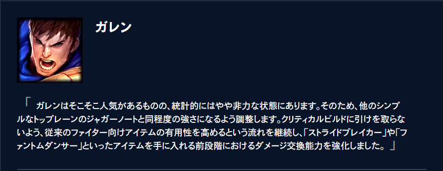 その操作難易度の低さから初心者から上級者まで様々なMMR帯で人気なガレンに大きなバフがされました!