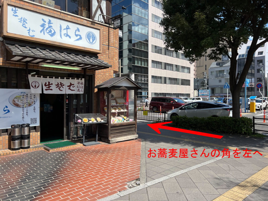 3.道路までまっすぐ進み、お蕎麦屋さんの角を左へ